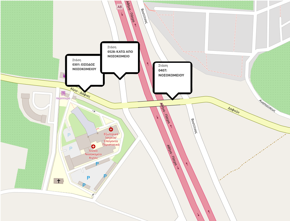 | Αίγιο - Βαλιμίτικα | Νοσοκομείο/Μεσσηνέζη – Καλλιθέα – Κέντρο – Συνοικισμός – Τέμενη – Βαλιμίτικα. |