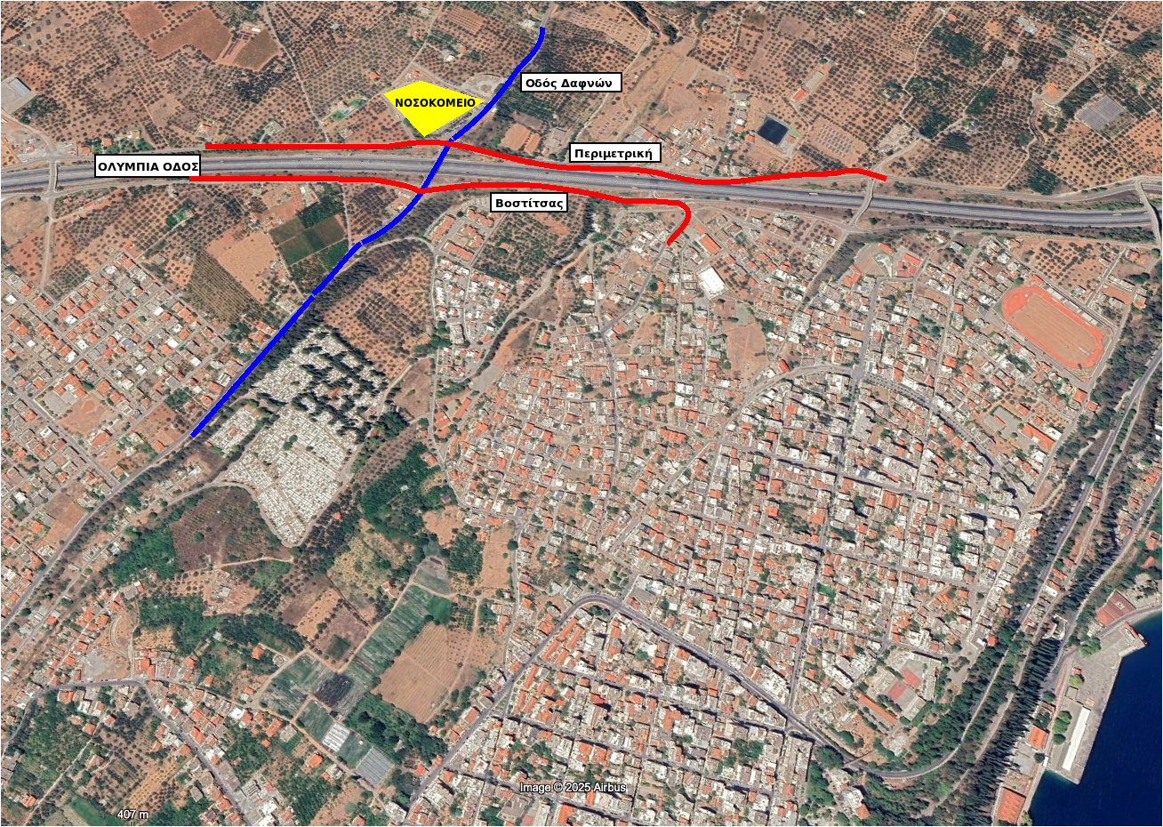 Από την πόλη του Αιγίου μέσω της Οδού Δαφνών και των παράπλευρων οδών του αυτοκινητοδρόμου της Ολυμπίας Οδού. (Περιμετρική, Βοστίτσας).